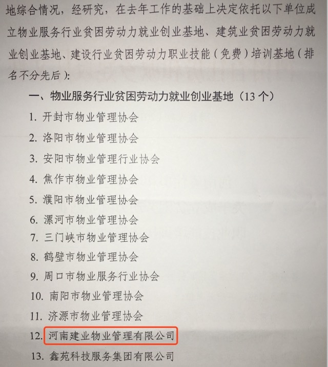 建業(yè)物業(yè)被評選為“物業(yè)服務行業(yè)貧困勞動力就業(yè)創(chuàng)業(yè)基地”