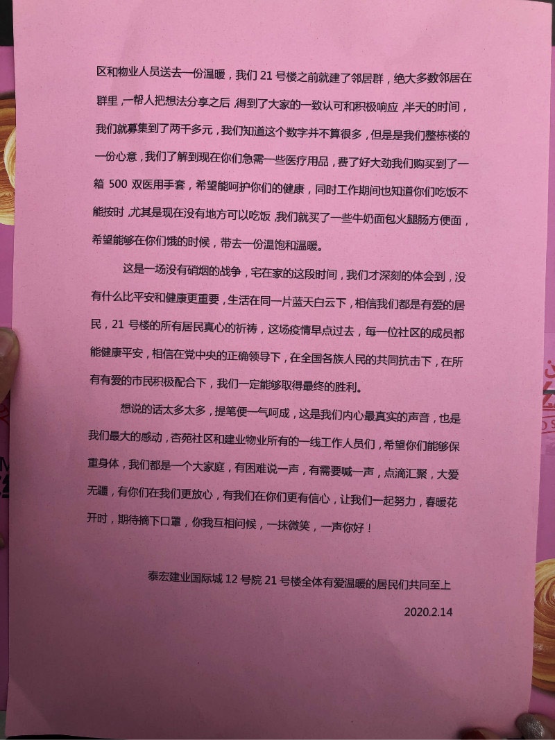 2月14日情人節(jié),鄭州泰宏建業(yè)國際城12號院21號樓的業(yè)主代表,帶著匯聚21號樓89名業(yè)主心意的防疫物資,為建業(yè)物業(yè)和杏花苑社區(qū)送來一篇長達千字的表白長文。