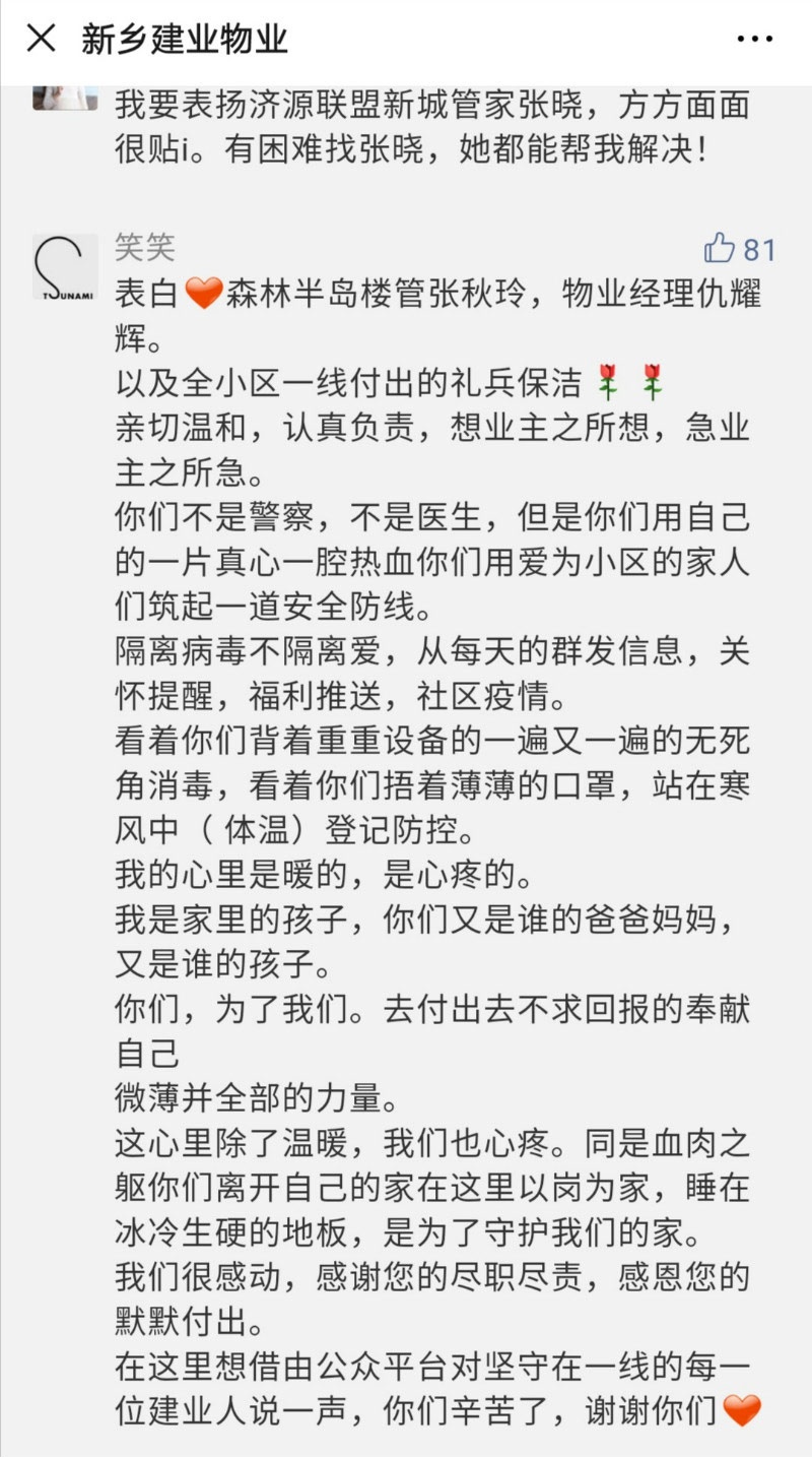 感謝您的盡職盡責(zé),感恩您的默默付出!在這里借由微信公眾平臺對堅守在一線的每一位建業(yè)人說一聲:你們辛苦了,謝謝你們!”——節(jié)選自新鄉(xiāng)區(qū)域業(yè)主的表白信