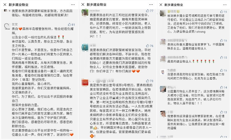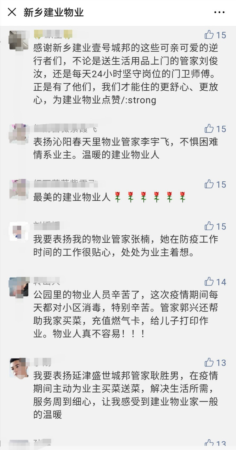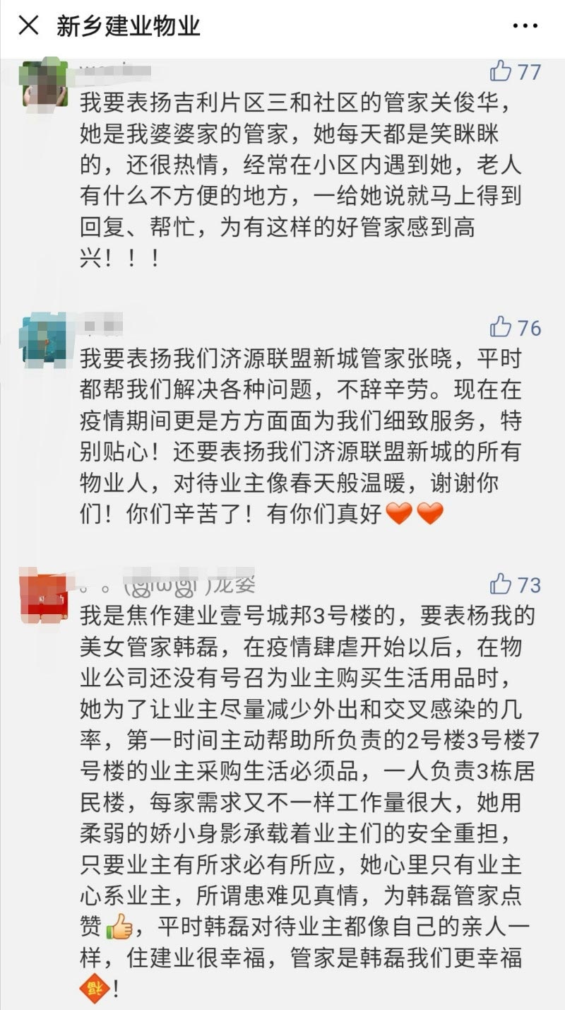 活動一經(jīng)發(fā)布,600余位業(yè)主花式留言表白建業(yè)物業(yè)工作人員,讓人心頭充溢著溫暖。