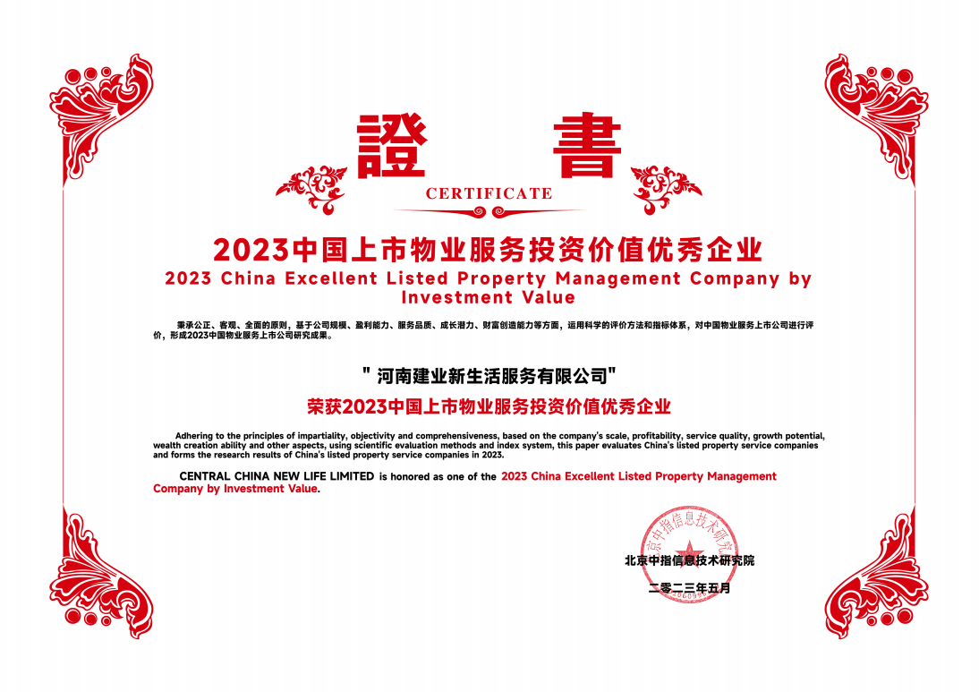 5月18日,由中國企業(yè)評價協(xié)會、清華大學房地產研究所、北京中指信息技術研究院研究主辦的“2023中國房地產上市公司研究成果”發(fā)布。建業(yè)新生活憑借資本市場的良好表現(xiàn),榮獲“2023中國物業(yè)服務上市公司綜合實力TOP10”和“2023中國上市物業(yè)服務投資價值優(yōu)秀企業(yè)”獎項。
