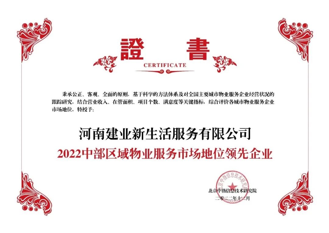 2022年12月7日,由北京中指信息技術(shù)研究院主辦,中國房地產(chǎn)指數(shù)系統(tǒng)、中國物業(yè)服務指數(shù)系統(tǒng)承辦的“2022中國房地產(chǎn)大數(shù)據(jù)年會暨2023中國房地產(chǎn)市場趨勢報告會”召開。 建業(yè)新生活憑借多年以來在中部地區(qū)穩(wěn)扎穩(wěn)打的表現(xiàn)榮獲“2022中部區(qū)域物業(yè)服務市場地位領(lǐng)先企業(yè)(TOP1)”“2022河南省物業(yè)服務市場地位10強企業(yè)(TOP1)”。 會上發(fā)布了“2022中國物業(yè)服務上市公司ESG測評研究報告”。中指研究院、中信證券研究部、北京秩鼎公司聯(lián)合對物業(yè)管理行業(yè)ESG體系開展研究與測評,對52家物業(yè)服務上市公司2021年度ESG報告表現(xiàn)進行了測評研究,將ESG報告評分按照總體得分排序。建業(yè)新生活榮
